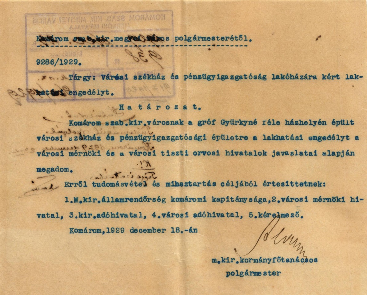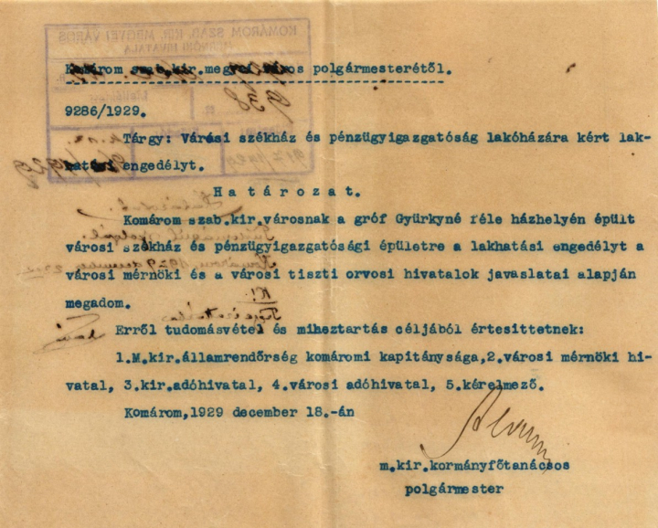 Komárom szab. kir. városnak a gróf Gyürkyné féle házhelyén épült városi székház és pénzügyigazgatósági épületre a lakhatási engedélyt a városi mérnöki és a városi tiszti orvosi hivatalok javaslata alapján megadom.