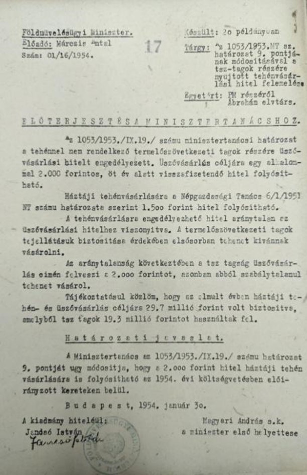 Forrás: HU-MNL-OL-XIX-K-1-c. 65. doboz, 01/16/1954. titkos sz. az 1053/1953. M.T. határozat 9. pontjának módosítása tsz tagok részére nyújtott tehénvásárlási hitel felemelésére, 1954. január 30.