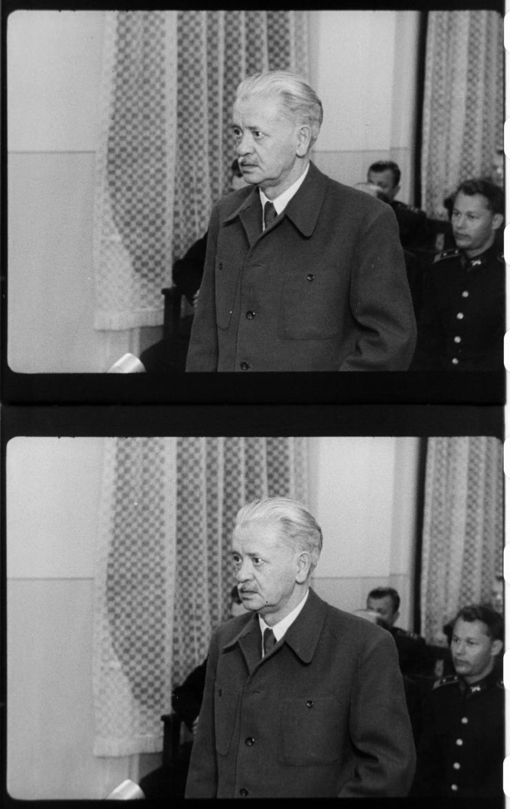 Fő utca 70-78., tárgyalóterem a katonai bíróság épületében. Tildy Zoltán vádlott, a Nagy Imre és társai elleni perben. Filmkockák a tárgyaláson készült felvételből.