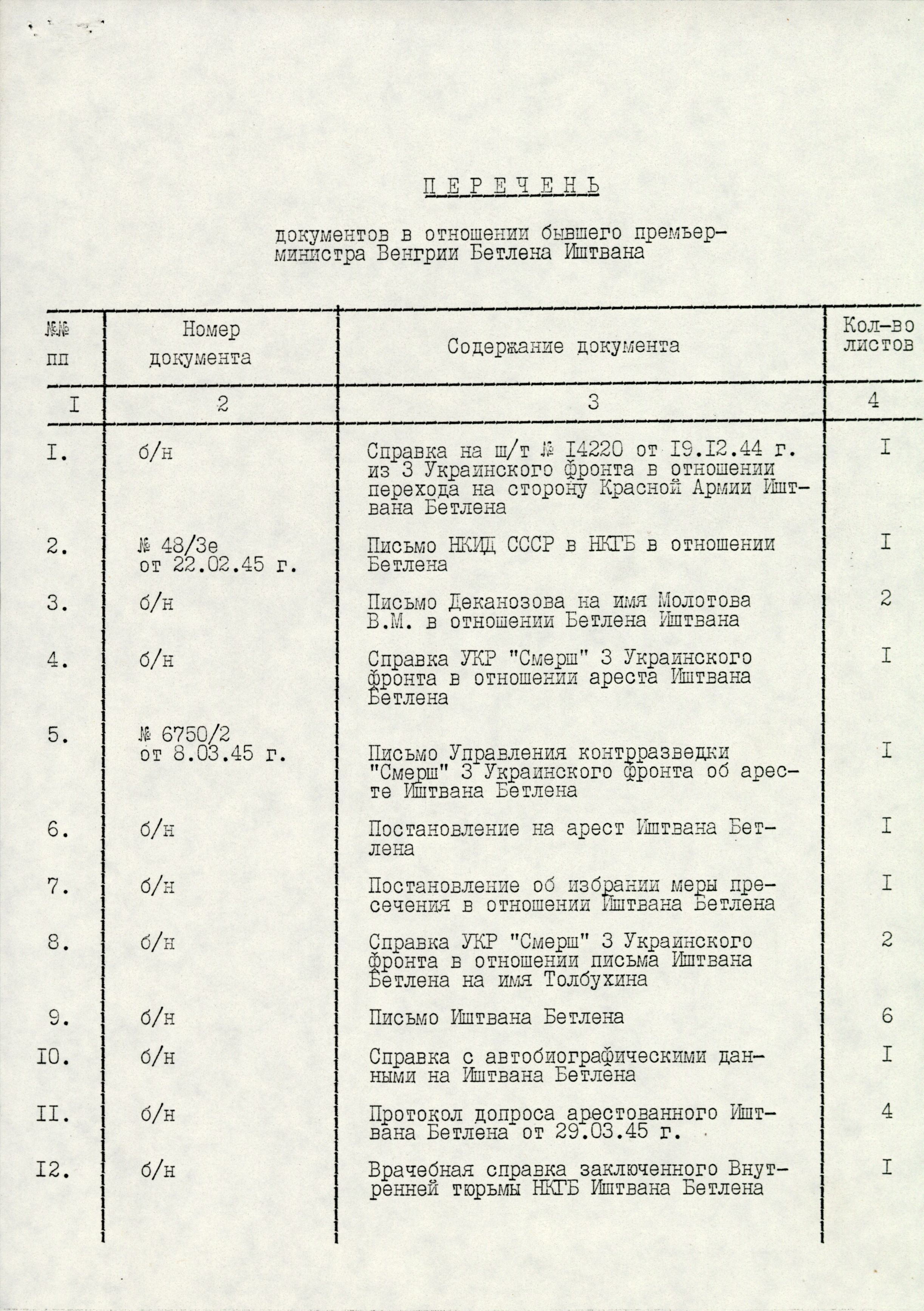 1.) Bethlen Istvánt 1945. március 27-én hurcolták a Szovjetunióba, ahol néhány napig az Állambiztonsági Népbiztosság Lubjankán lévő hírhedt börtönében tartották fogva. A rossz egészségügyi állapota miatt április 1-jén átszállították a Butirszkaja börtön rabkórházába. A „második dossziéban” több olyan dokumentumra is bukkanhatunk, amelyek alapján kitapinthatók a Bethlennel szembeni bánásmód bizonyos ismérvei, például az, hogy milyen ellátásban volt része. Noha az orosz levéltári forrásokból semmilyen utalás nincs arra vonatkozóan, hogy Bethlent milyen minőségben tartották fogva,[12] az ő élelmezésére is minden bizonnyal a Szovjetunió Belügyi Népbiztosságának a hadifoglyok élelmiszer-ellátmányi normáira vonatkozó utasításai voltak irányadók. Bethlen 1945. április 1-jén került a Butirszkaja börtön rabkórházába, így az ellátását illetően az ott töltött hónapjai legnagyobb részében, egészen a haláláig, a Belügyi Népbiztosság 1945. május 19-i 540. számú utasítása volt érvényben. Eszerint a lágerkórházban ápolt beteg hadifoglyok napi normája mind annak minőségi összetételét, mind a mennyiségét tekintve jóval jobb volt, mint a táborokban tartott sorállományú hadifoglyok, és kicsivel jobb, mint a táborokban tartott tisztek napi fejadagja. Például a lágerkórházban ápoltak napi 80 gramm húst kaphattak, míg a táborokban lévő sorállományúak csak 30 grammot, a szalonna és zsiradék fejadagjuk pedig duplája volt (30 gramm, illetve 15 gramm), a rozskenyér mellett búzakenyeret is kaptak, míg utóbbiak csak rozskenyeret stb.[13]