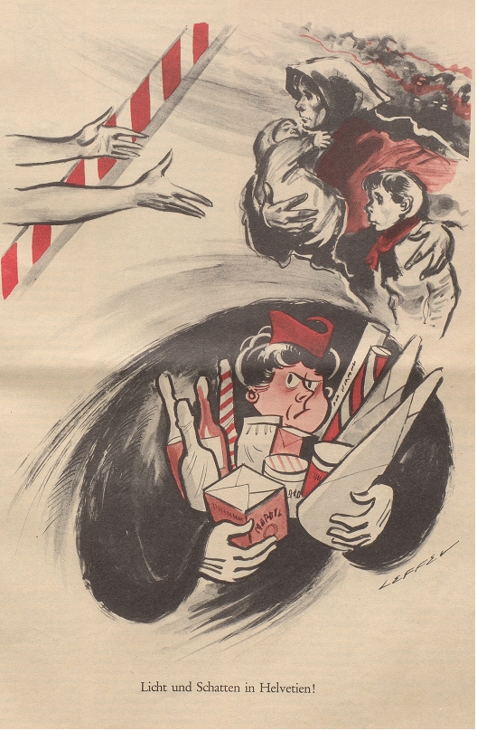 11. kép: Fény és árnyék Helvéciában! Jean Leffel rajza. Nebelspalter, 82. évf. 47. sz. (1956. november 21.) 17.