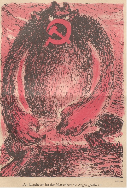 9. kép: A szörnyeteg felnyitotta az emberiség szemét! Alexander M. Kaiser (álnevén: A. M. Cay) rajza. Nebelspalter, 82. évf. 49. sz. (1956. december 5.) 7.