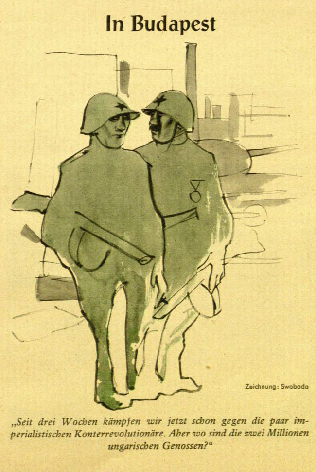 újságok a híráramlás nehézkessége miatt eleinte nehezen tudták értelmezni az eseményeket, így igyekeztek tárgyilagosan tudósítani a helyzetről. Miután azonban híre ment a Varsói Szerződés haderejének főparancsnoka, Konyev marsall által vezetett szovjet hadsereg közbelépésének, a cikkekben érezhetővé vált a demokratikus szabadságjogok érvényesítéséért való kiállás brutális megtorlásán való felháborodás, a szolidaritás a magyar néppel, illetve a sajnálkozás a Nyugat cselekvésképtelensége . A vicclapok reakciója sem maradhatott el. Egyrészt a modern szatíra bevett eszköztárával (karikatúrák, gúnyos karcolatok, stb.) kritizálták a szovjet vezetést, Kádár Jánost, valamint a Nyugatot (a lapok munkatársainak szemében a segélyszállítmányok küldése és a menekültek befogadása nem bizonyult elegendő segítségnek), másrészt viszont nem kifejezetten nevettető szándékú műalkotások is megtalálhatóak bennük (grafikák, illetve a Simplicissimusban még egy siratóvers is), amelyekkel a szabadságharcosokkal való szimpátiájukat kívánták kifejezni.Forrásközlésem három, a vasfüggönyön túli német nyelvű szatirikus