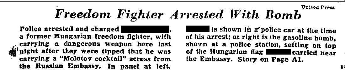arról számolt be, hogy egy fiatal magyar szabadságharcos, [J. B.] magyar zászlót bontott ki a magyar forradalom kitörésének egyéves évfordulóján a szovjet nagykövetség épületével szemben. Az eseményen több fotóriporter is jelen volt. A rendőrség felszólította [J. B.]-t, hagyja el a környéket, amit ő meg is tett. Az egyik rendőr azonban jelezte, hogy egy bombát látott a demonstráló férfinél, így utána mentek. Félórával később találták meg és tartóztatták le [J. B.]-t. Egy Molotov-koktél volt nála, amit állítása szerint nem állt szándékában használni.További egyesült államokbeli tartózkodásáról egy vele készült interjúból derülnek ki