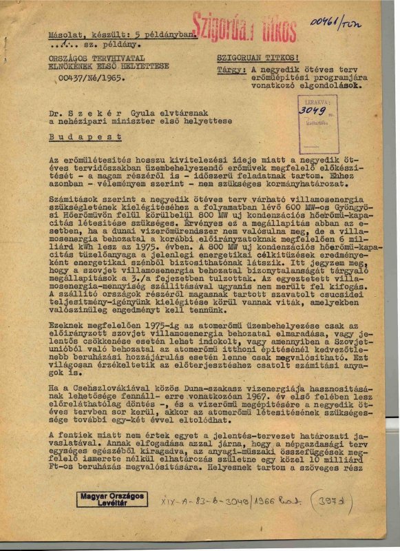 4. Vályi Péternek, az Országos Tervhivatal elnökhelyettesének véleménye a Nehézipari Minisztérium erőműépítési programjáról (1965. december 24.)