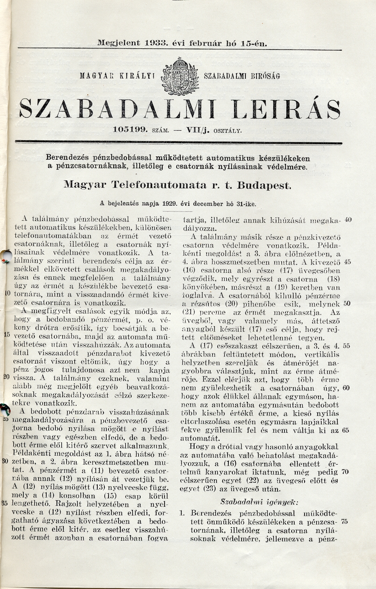 Budapest Székesfőváros Tanácsa, a Magyar Királyi Szabadalmi Bíróság, a Magyar Telefonautomata Rt., valamint a Standard Villamossági Rt. dokumentumai – szabadalmi okirat, telefonállítási szerződés, szabadalmi- és műszaki leírások – az első nyilvános, pénzbedobós telefonkészülékek felállításáról és gyors elterjedéséről tájékoztatnak az 1920-as évek végétől a második világháború befejezéséig.