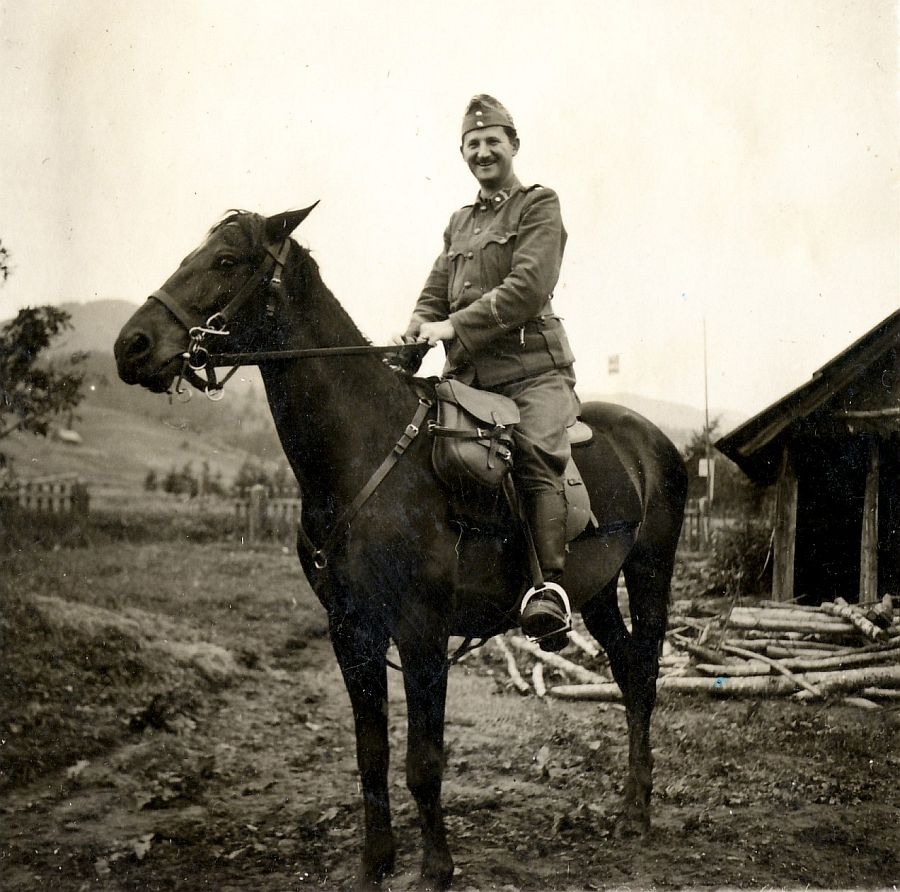 nem könnyű bemutatni. Néhány, a családnál fennmaradt dokumentum és a Néphadseregben kiállított katonakönyve alapján azonban vázlatosan ez is megismerhető volt. Póttartalékosként vonult be a pécsi 8/I. gyalogzászlóaljhoz, ahol 1937. október 5-től 1937. december 18-ig kapott kiképzést. Ezt követően, 1939-ben is behívták zászlóaljához négy hónapra, ennek során fordult meg először Kárpátalján. Az 1939 márciusában, Kárpátalja elfoglalására mozgósított 11. önálló dandár alárendeltségében lévő zászlóaljával ugyanis elvonult Kárpátaljára, a Felső-Tisza völgyébe. A határsávban állomásozó és legelőször bevetett, illetve az előttük felvonuló gyorscsapatokat követő 8/I. zászlóalj már nem vett részt a közvetlen harcokban.Erb Jenő hadapród őrmester 1944-ben Kárpátalján (a szerző gyűjteményéből) |
