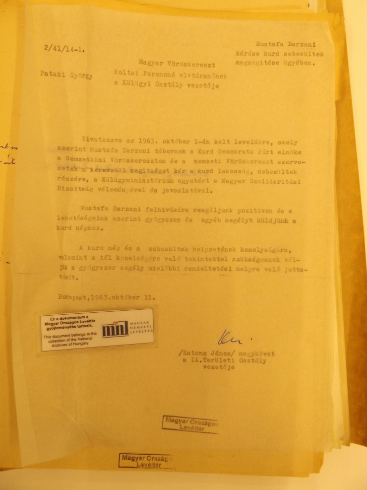 Hivatkozva az 1963. október 1-én kelt levelükre, amely szerint Mustafa Barzani tábornok a Kurd Demokrata Párt elnöke a Nemzetközi Vöröskereszten és a nemzeti Vöröskereszt szervezeteken keresztül segítséget kér a kurd lakosság, sebesültek részére, a Külügyminisztérium egyetért a Magyar Szolidaritási Bizottság véleményével és javaslatával.
