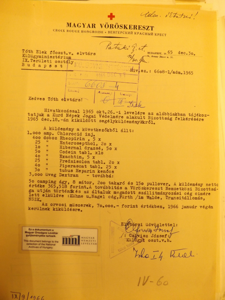 [29] Magyar Vöröskereszt segély küldése a kurdok megsegítésére. HU-MNL-OL-XIX-J-1-j-(1945–1964.)-Irak-16/i-00291/1/1963 (4. doboz).