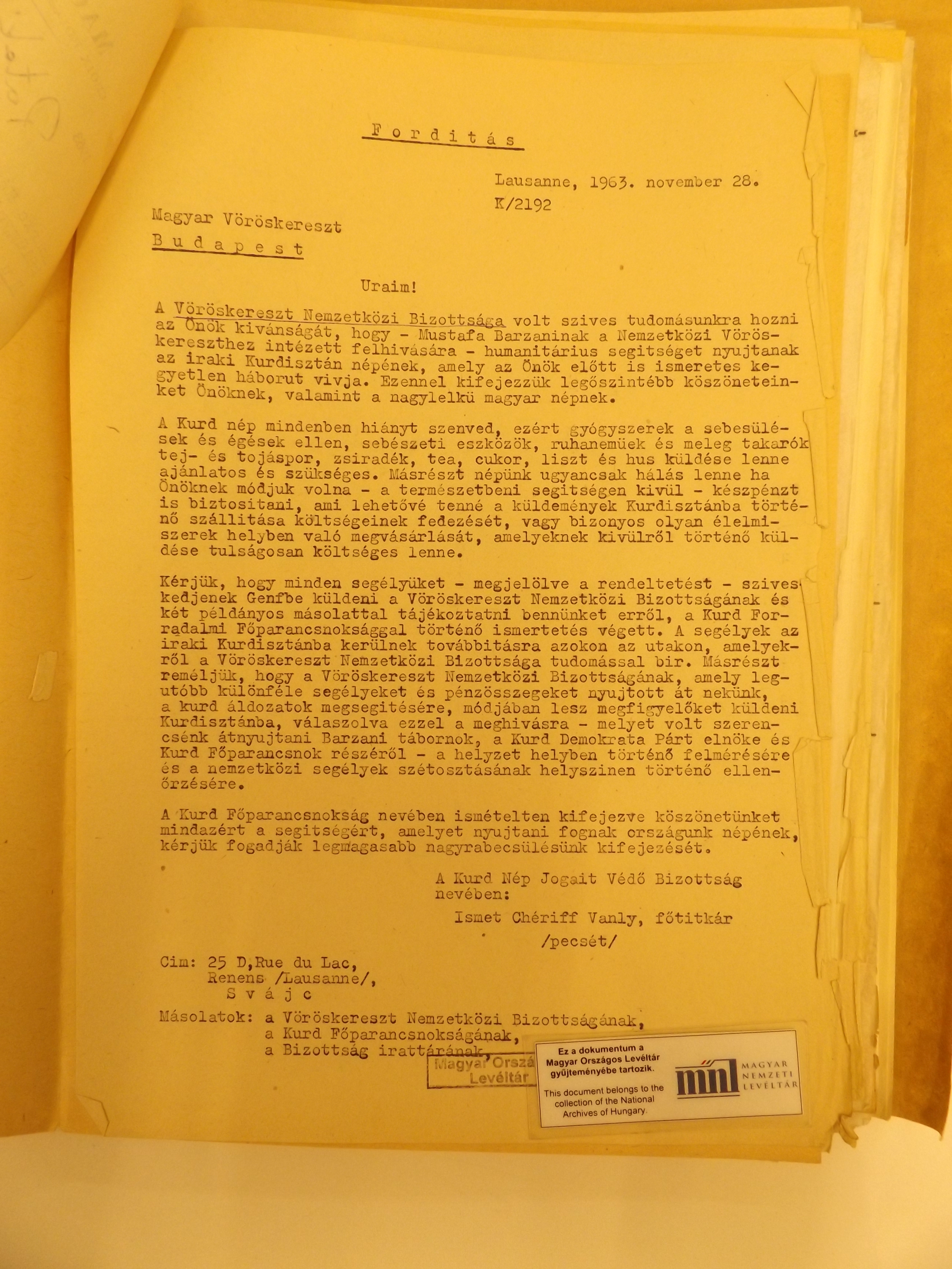 A Vöröskereszt Nemzetközi Bizottság volt szíves tudomásunkra hozni az Önök kívánságát, hogy – Mustafa Barzaninak a Nemzetközi Vöröskereszthez intézett felhívására – a humanitárius segítséget nyújtanak az iraki Kurdisztán népének, amely az Önök előtt is ismeretes kegyetlen háborút vívja. Ezennel kifejezzük a legőszintébb köszöneteinket Önöknek, valamint a nagylelkü magyar népnek.