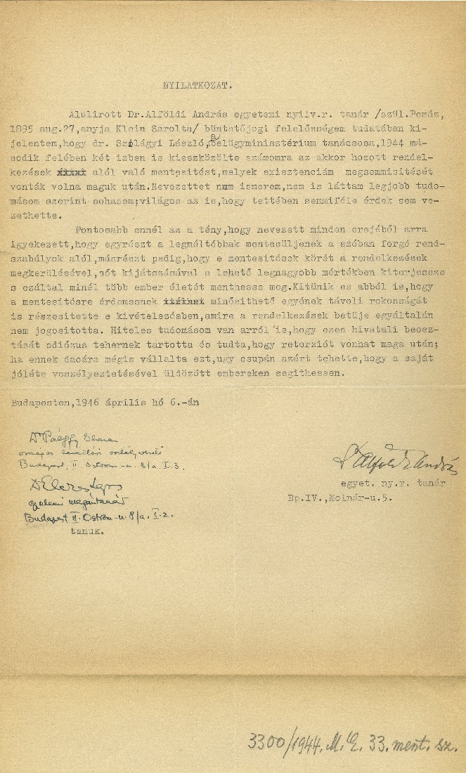 . Ezután engem rendelt magához, és azt közölte velem, hogy tüzetesen meg fogja vizsgáltatni a zsidók mentesítési ügyeiben való szerepemet, ezért a közjogi osztály mentesítései iktatóhivatalából és irattárából kitilt, azt lezáratja, lepecsételteti eléje állandó rendőrszemet állíttat. Ezt követően géppisztolyos nyilas pártszolgálatosokkal nyomban végrehajtatta a hivatal lezárását és a rendőrőrszem felállítását, amely aktusnál nekem jelen kellett lennem. Ha Bodonyinak ideje marad végrehajtatni ezt a vizsgálatot, az a mentesítettekre, továbbá tisztviselőtársaimra és reám a legnagyobb veszélyt jelentette volna, mert a nyilasok feltétlenül súlyos bűnnek minősítették volna azt, hogy a május 30. után elkésetten benyújtott kérvényeket a tárgyalásból nem vontam ki, a kedvezőtlen főispáni felterjesztések ellenére a mentesítések hatálytalanítása iránt semmit sem tettem és számos családon segítettem, amit az ott lévő sok meleg hangú köszönőlevél igazolt.Alföldi András egyetemi tanár, ókorkutató köszönőlevele, 1946. április 6. |