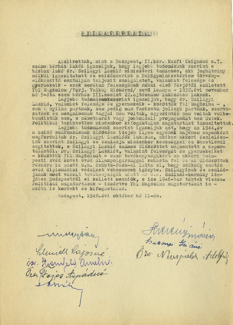 Rózsahegyi Kálmán színművész nyilatkozata Szilágyi László embermentő munkájáról, 1946. április 18. |