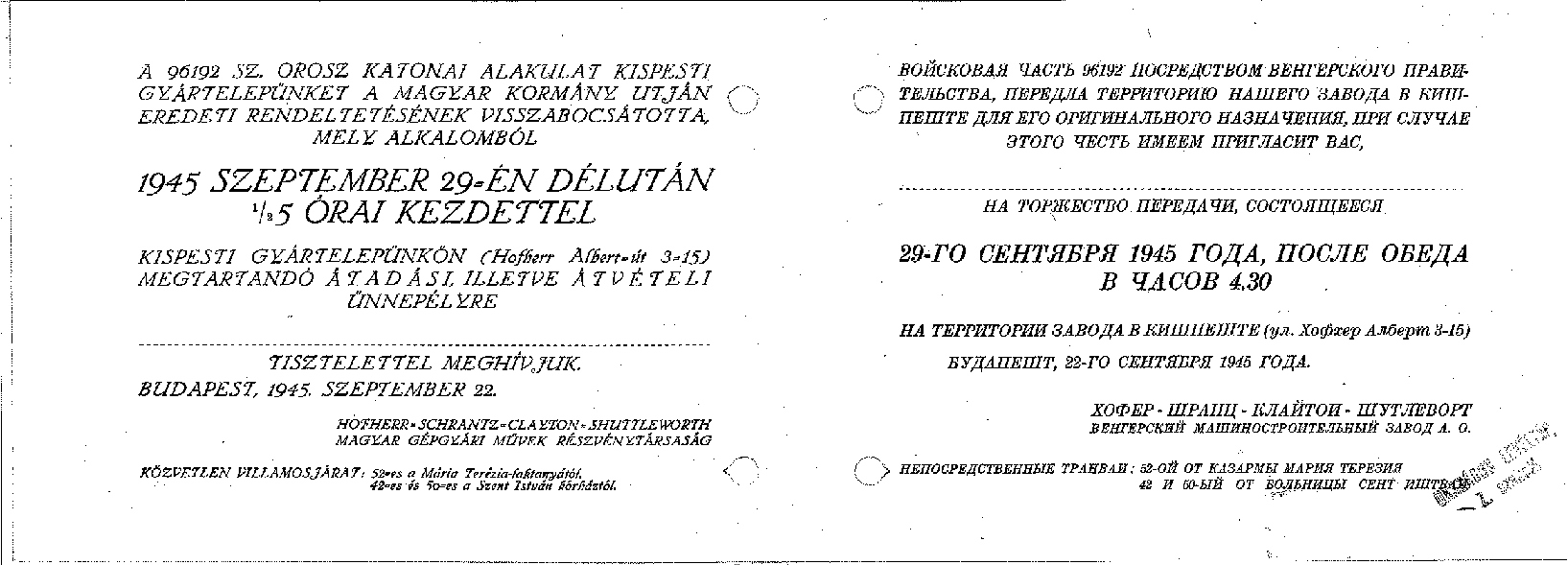 Felvétetett a SZ.E.B. elnökének K. JE. Vorosilov tábornagy úrnak parancsára az Acéltank, mechanikai Alakulatok, a hadsereg kiegészítő-csapat parancsnoka Novikov vezérezredes meghagyása alapján, általam a 96192. sz. Vörös Hadsereg parancsnoka V. M. Kolomjec mérnök őrnagy egyrészről, másrész a Magyar Iparügyi Minisztérium meghatalmazottja Csűrös László miniszteri tanácsos között, a Vörös Hadsereg 96192. sz. alakulata által, az 1945. I. 12-e óta használt Hofherr és Schrantz gyár átvétel-átadása tárgyában.