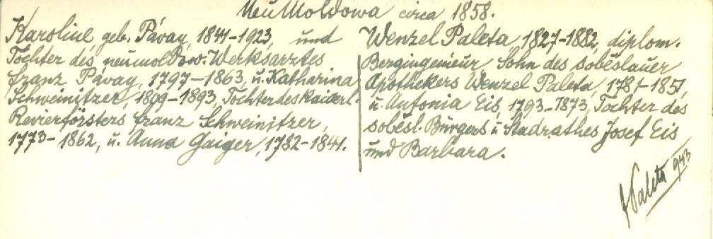 Paleta Géza apai nagyapja, tehát Karoline Pávay férje Wenzel Paleta/Paleta Vencel (1827-1882) mérnök volt. Az ő édesapja pedig, idősebb Wenzel Paleta/Paleta Vencel (1781-1857) patikus, akinek feleségét leánykori nevén Antonia Eis-nek hívták (1793-1873). Ő Josef Eis polgár és felesége, Barbara leánya volt. Az ezt igazoló fennmaradt forrás (egy fénykép hátuljára írt feljegyzés) Wenzel Paletáról ezt írja: sobeslauer apotheker, míg Jozef Eisről: sobeslauer bürger. A szaktudást igénylő foglalkozások, a cseh eredetre utaló név, a németes környezet, sőt a fénykép hátoldalán levő feljegyzés német nyelve igen valószínűvé teszi, hogy jelen esetben szó sincs a magyar Szoboszlóról (a későbbi Hajdúszoboszlóról). Sokkalta inkább a csehországi Soběslav (német nevén: Sobieslau) városában kell keresnünk a Paleta-ősök eredetét. Mindez azonban a kutatás jelen szakaszában csupán igen meggyőző és erős valószínűség, hipotézis, amíg további kutatások meg nem erősítik vagy meg nem cáfolják ezt a tételt.