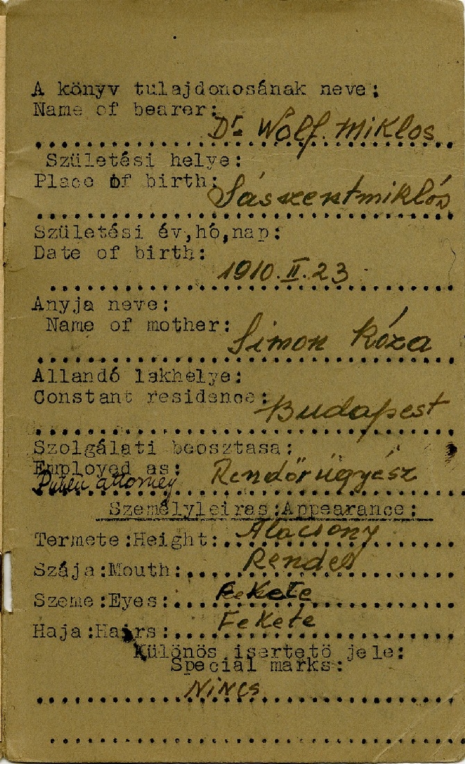 "14. Dr. Wolf Miklós rendőrügyész ezzel a rendőrtiszti szolgálati könyvvel igazolta magát. |