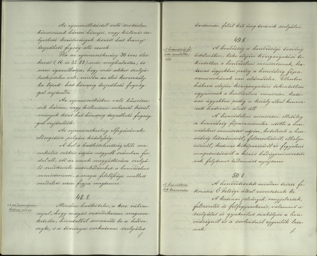 48. § Minden hadköteles, a kire rábizonyul, hogy magát szándékosan megcsonkította, hivatalból sorozandó be a hadseregbe, s a törvényes sorkatonai szolgálat tartamán felül két évig tartozik szolgálni.