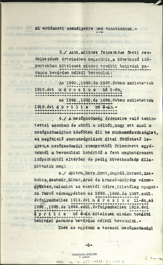 2. Rendelkezés az 1894-1899-ben született korosztályok felmentett tagjainak behívásáról, kivéve egyes vállalatok alkalmazottait