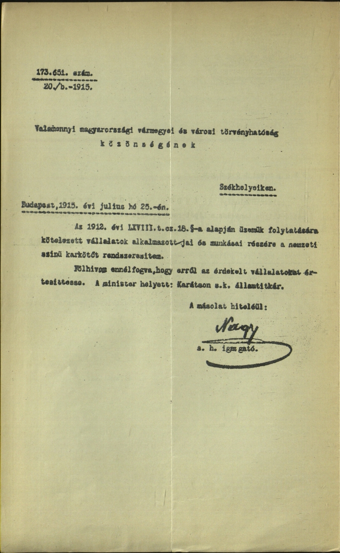 Az irat jelzete: MNL OL K 148-1915-25-27201. - Eredeti, gépelt aláírással ellátott levél és sokszorosított körlevél.