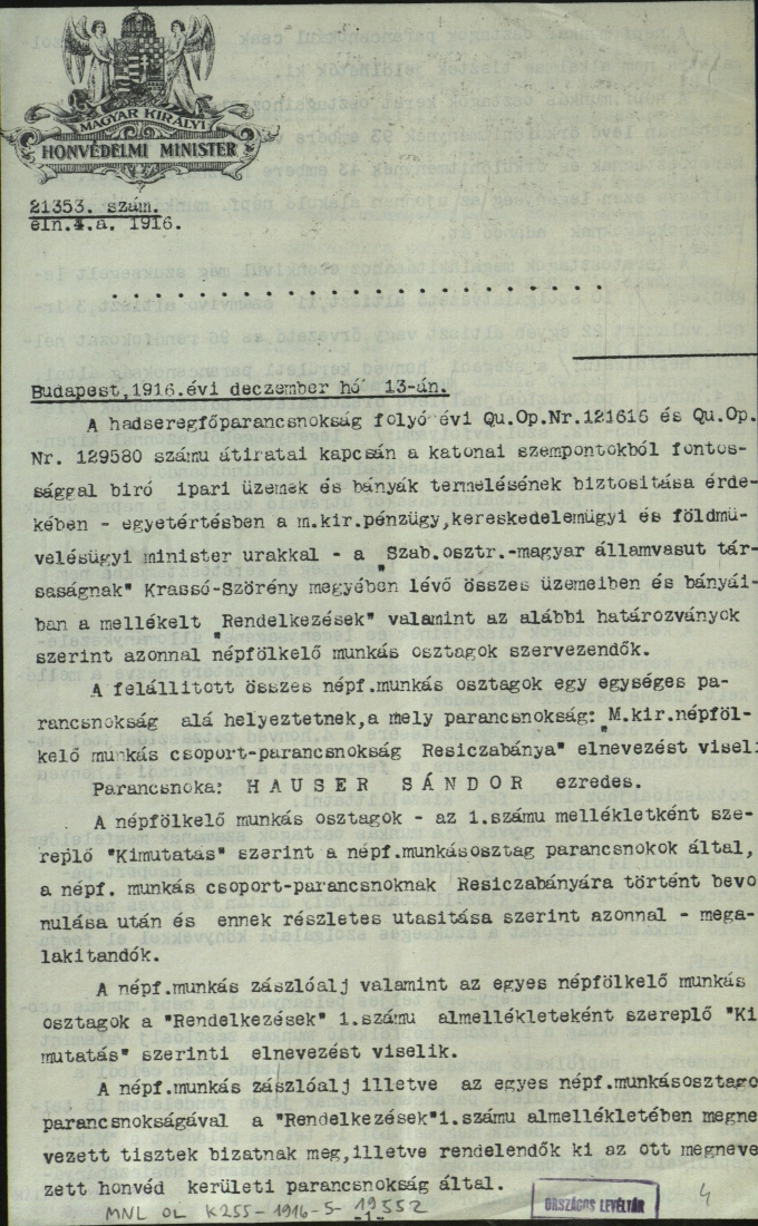 4. A honvédelmi miniszter rendelkezése a gyárakban, üzemekben, bányákban alakítandó népfölkelő munkásosztagok számára