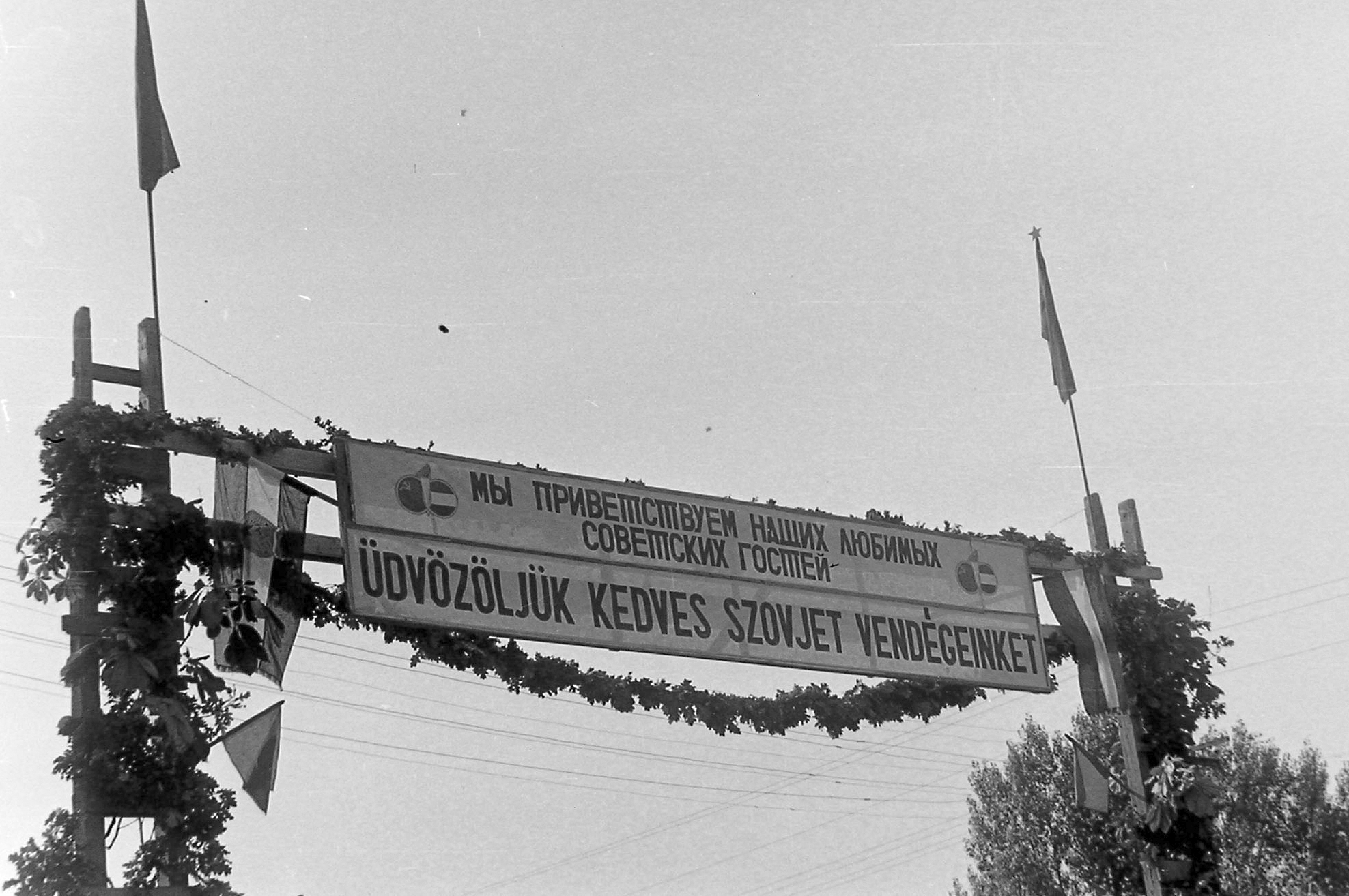 Szovjet kolhozküldötteket fogadó díszkapu a nagykőrösi termelőszövetkezetben, 1951