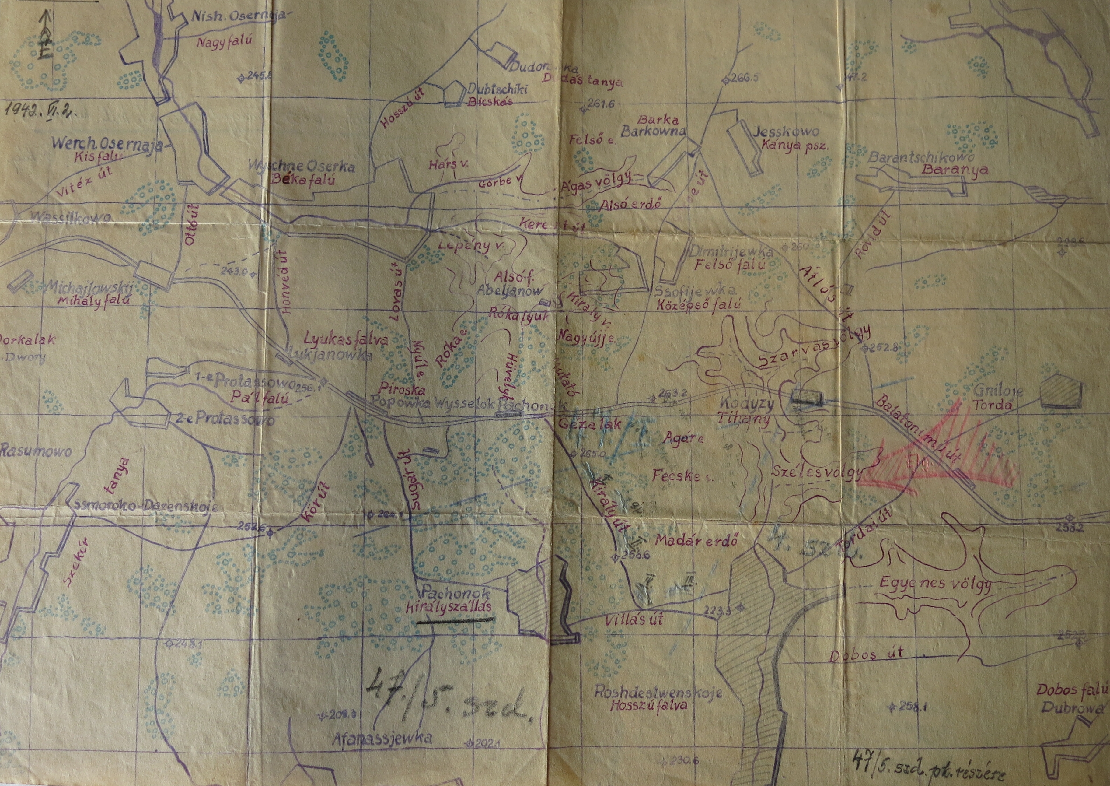 [111] Német katonai térkép alapján készített indigós térképvázlat – a naplóíró meghatározása szerint: „térképvázlat célmegjelöléshez távbeszélőn” – a 47/II. zászlóalj Pahonok környéki arcvonalszakaszáról, rajta (lilára színeződött) piros betűvel az egyes földrajzi nevek magyar nyelvű fedőnevei. (Lásd a 6. sz. képmellékletet.) Felirat a jobb alsó sarkában: „47/5. szd. pk. részére”. (Tuba László hagyatéka.)