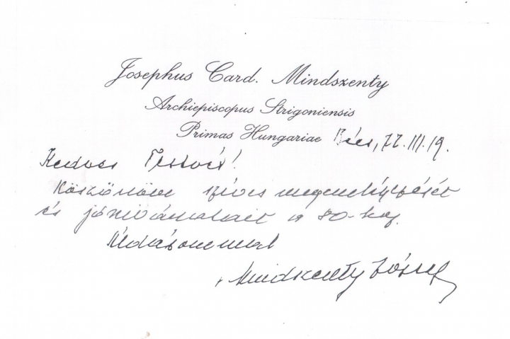 Mindszenty József üdvözlő sorai Tomek Vincének (1972).