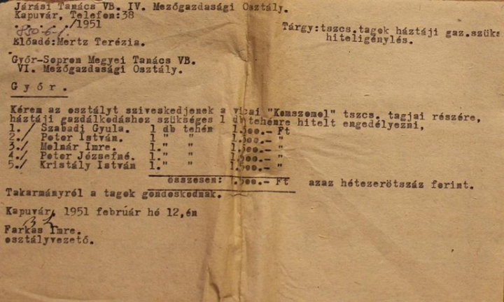 Forrás: HU-MNL-OL-XIX-K-1-c. 65. doboz, 01/16/1954. titkos sz. az 1053/1953. M.T. határozat 9. pontjának módosítása tsz tagok részére nyújtott tehénvásárlási hitel felemelésére, 1954. január 30.